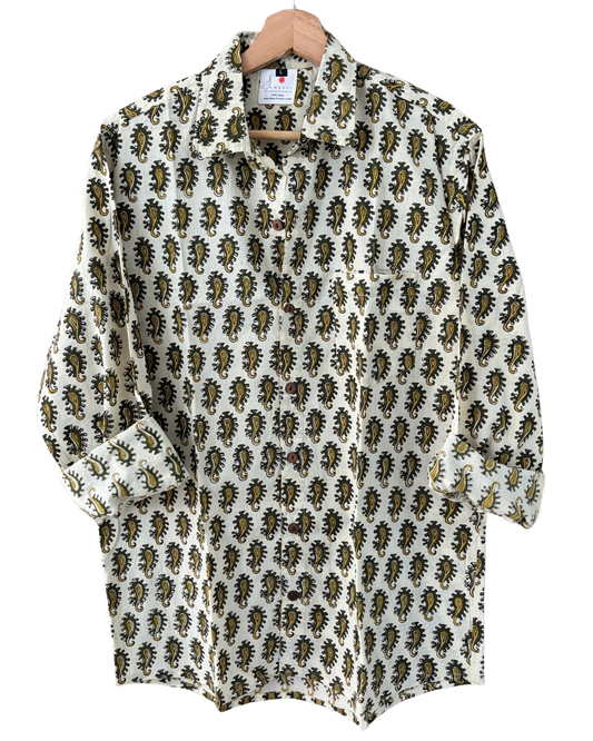 Hand Blockprinted Cotton Full Sleeve Shirt for Men - Regular Fit - Beige Brown Paisley Motifs
