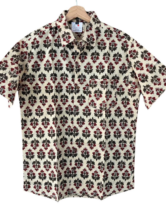 Hand Blockprinted Cotton Half Sleeve Shirt for Men - Regular Fit - Beige Brown Red Floral Pattern