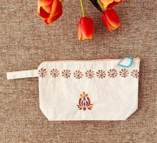 Handpainted Cotton Travel/Makeup Pouch with embroidery on both sides