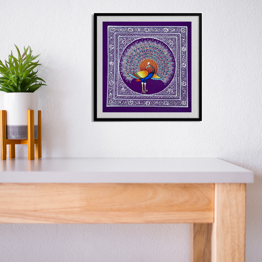 Rajasthani Handmade Miniature painting Royal Peacock Purple background facing Left