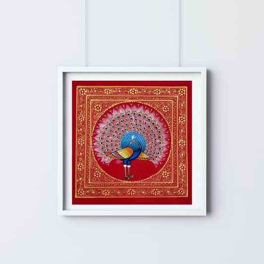 Rajasthani Handmade Miniature painting Royal Peacock Red background facing Left