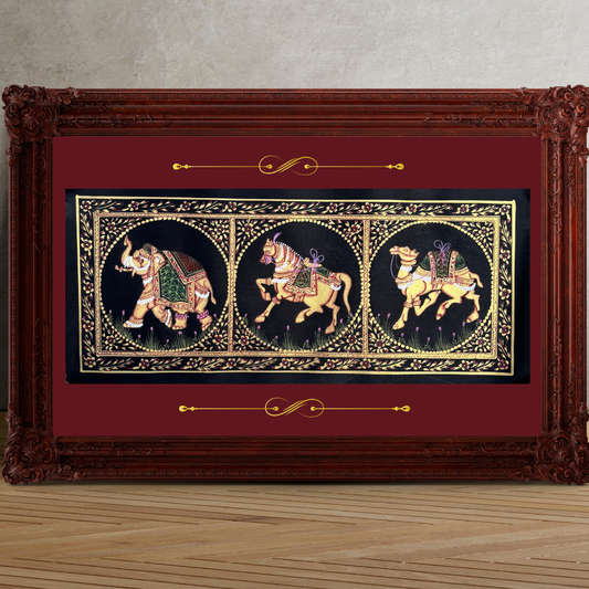 Rajasthani Handmade Miniature Painting Camel Elephant Horse Trio Black Colour with Golden Detailing