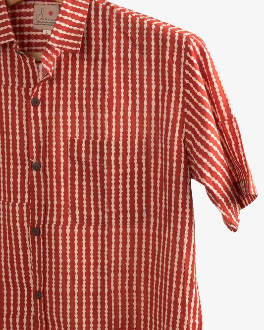 Hand Blockprinted Cotton Half Sleeve Shirt for Men - Regular Fit - Red Stripes