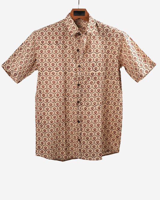 Hand Block printed Cotton Half Sleeve Shirt for Men - Regular Fit - Beige