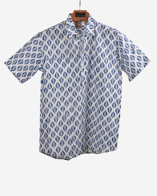 Hand Blockprinted Cotton Half Sleeve Shirt for Men - Regular Fit - White Blue Motifs