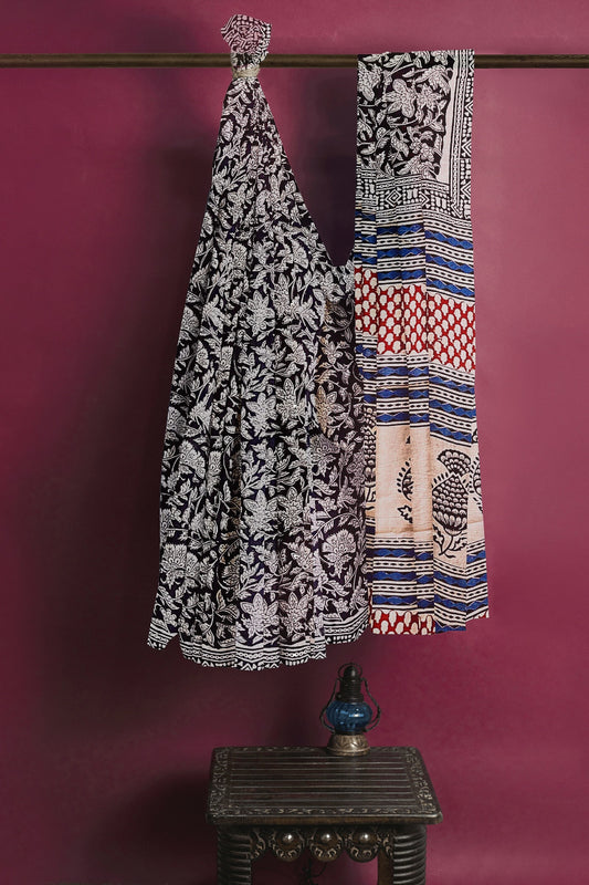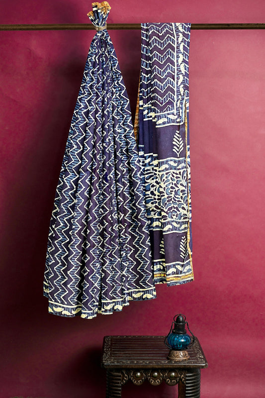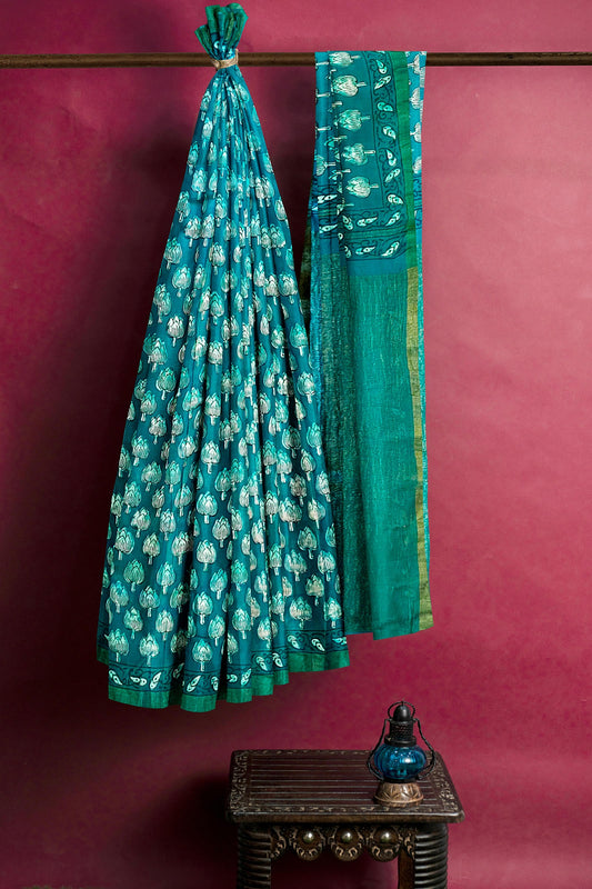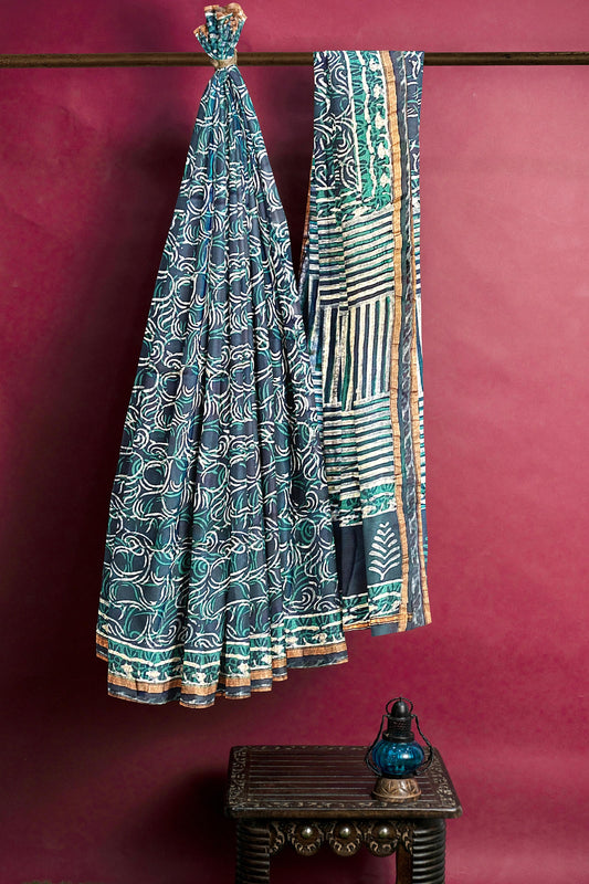 Hand Blockprinted Modal Chanderi Silk Saree-Indigo Blue
