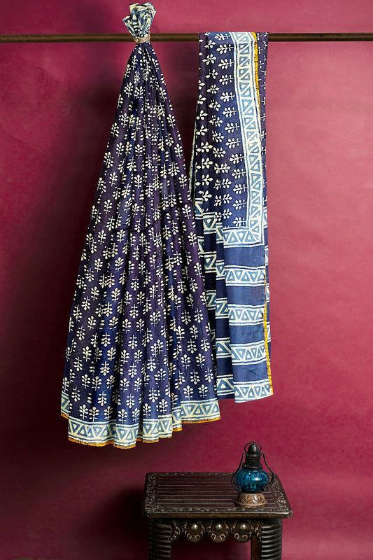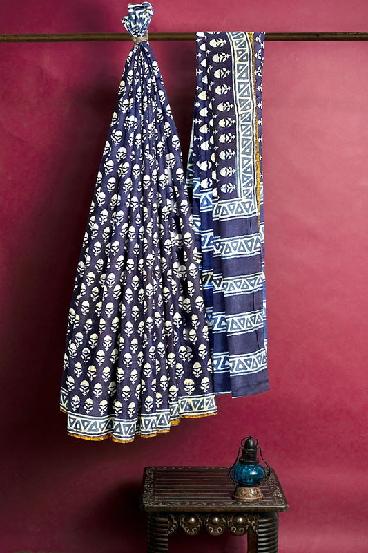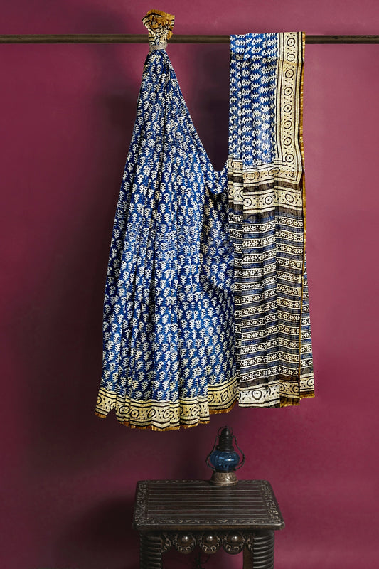 Hand Blockprinted Chanderi Silk Saree-Indigo