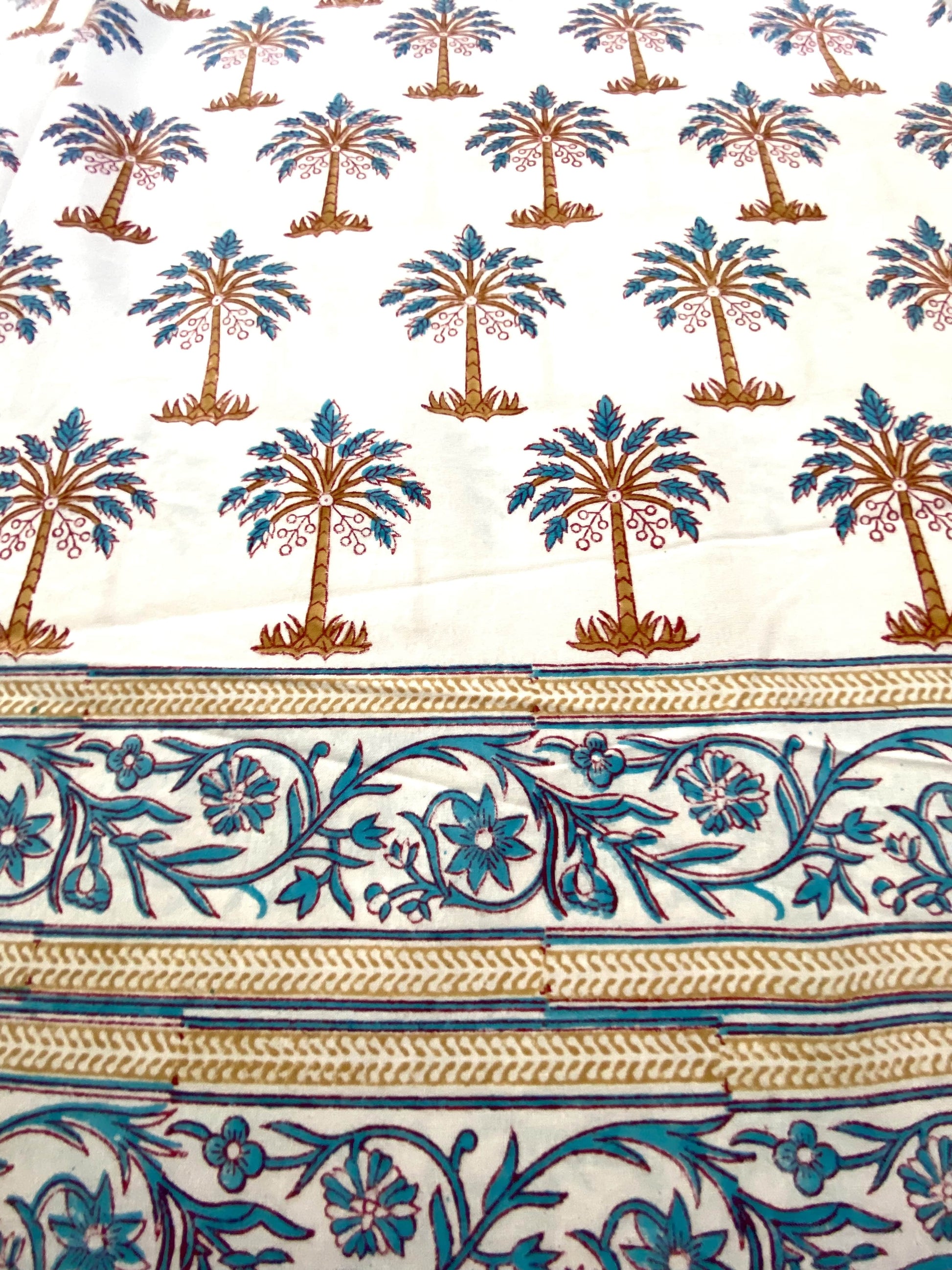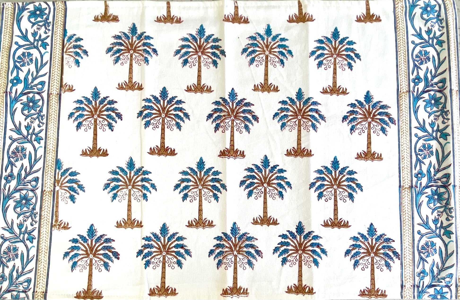 Discover the best craftsmanship at Sumaavi. The rural artisans of Rajasthan's Bagru village crafted these hand-block-printed bedsheets and pillowcases. The artwork has the perfect balance of colour and charm, but what really sets it apart is the process and colours used to print the unique artwork. Made of 100% cotton, it's the most comfortable hug after a long day. The unique blue palm trees truly accentuates any room setting. The perfect way to add warmth, a touch of colour, and texture to your room.
